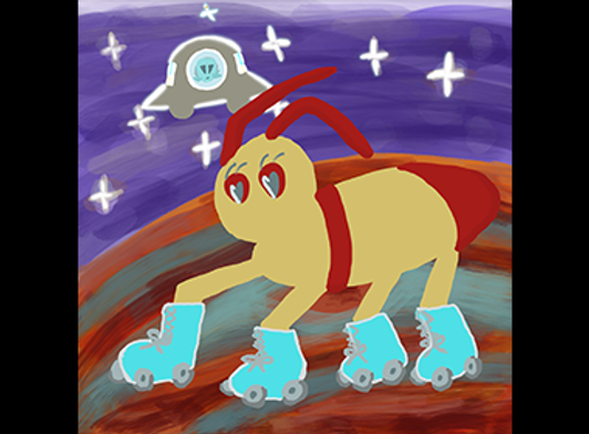 POCHI、Umekoさんが木星で出会った虫。最初はとても驚いていたUmekoさんでしたが、すぐにUmekoさんの旅についてきてくれたポチに懐きました。木星にはさまざまな色のポチの群れが住んでいます。このポチの興味は自転車に乗ることです。ローラースケートのように、スピードを感じられる動き、ポチは夢中です。