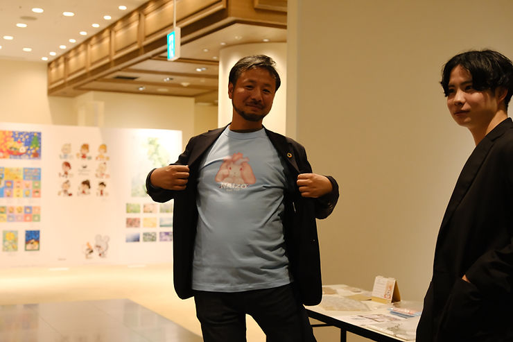 講演者の佐久間さんが、同社のオリジナルキャラクター「しんぞうさぎ」Tシャツをアピール!
