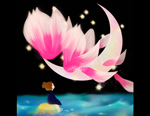 ご覧くださりありがとうございます。散ってゆく木蓮の花びらを海月に乗った女の子が見つめています。全てのものは移りゆくという時間の流れを描けたらと思いました。自然は時間の移り変わりを、容赦なく、そしてとても美しく私たちに教えてくれます。