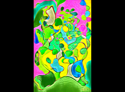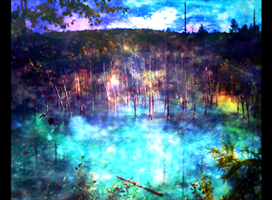 木々に囲まれた池をモチーフとしたグラフィックアートになります。夜の幻想的な雰囲気に仕上げました。