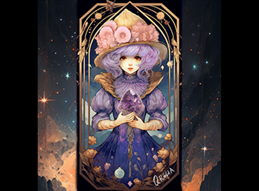 このアート作品は、宇宙の壮大な宙域とアメジストの謎めいたエネルギー、そしてタロットカードの神秘的な世界を融合した作品です。
