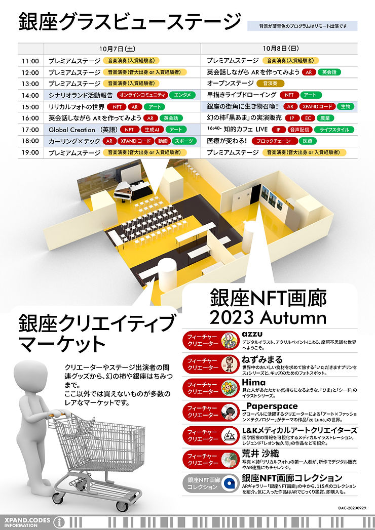 10月7日と8日の2日間、東京銀座「キラリトギンザ」にて「デジタルアート&クリエイティブフェスタ銀座」を開催します。 アート展示、ステージプログラム、マーケットで構成されるイベントの詳細を発表します。 お得な前売りチケットをPeatixで販売中です。ぜひ早目にお買い求めください。