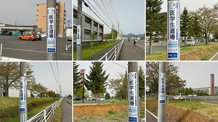 医学生道場のターゲットである医学生との接触機会を拡大することを目的とし、電柱広告を導入する最初の実施地域として岩手県の医大キャンパス周辺に電柱広告を複数設置しました。条例により看板やビジョンの設置が難しい地域ですが、電柱広告で医学生へメッセージを伝えることが可能になりました。